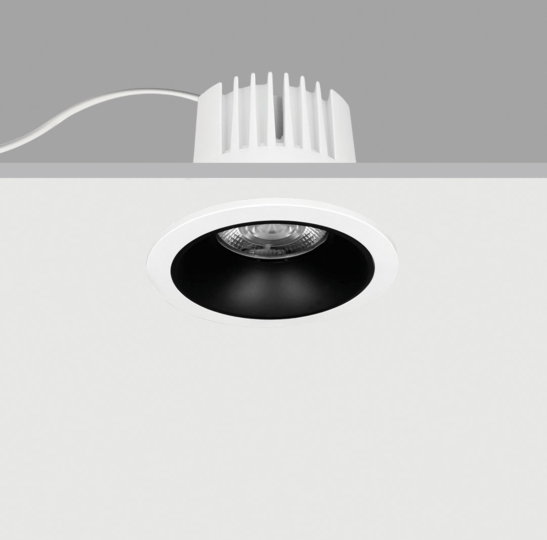 Downlight fisso di forma circolare da incasso a LED. Sistema emittente ad ottica fissa con lente ad alta efficienza in PMMA. La posizione arretrata del LED minimizza l’abbagliamento e permette di ottenere un elevato comfort luminoso. Corpo in lega di alluminio pressofuso. Elemento antiglare personalizzabile nel colore, su richiesta.